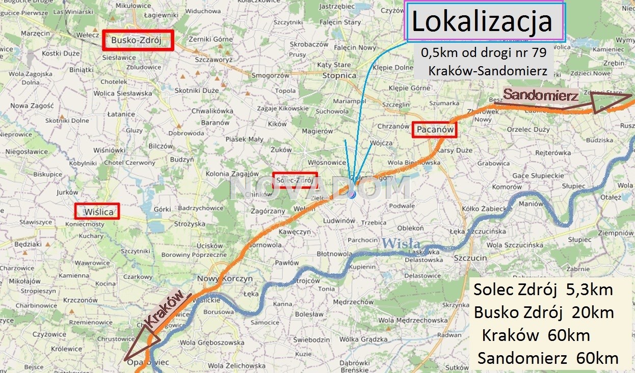 - w połowie trasy Kraków-Sandomierz, ok. 0,5km od drogi nr 79 w kierunku południowym