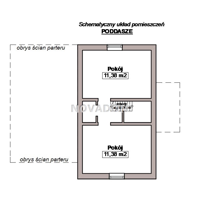 Poddasze: dwa pokoje, wydzielona komunikacja, pomieszczenie pomocnicze.