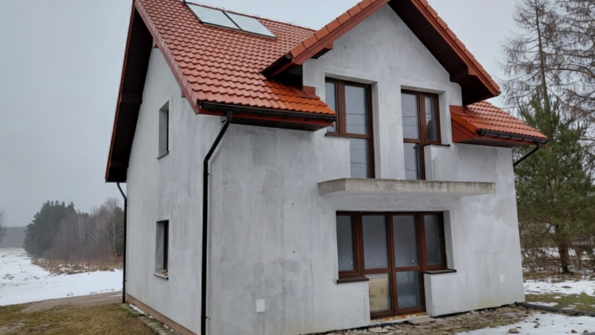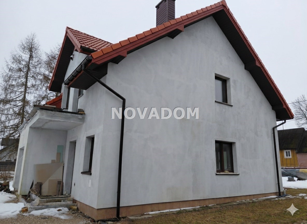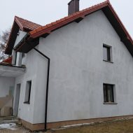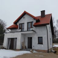 Materiał budowlany- suporek 24 cm, ocieplanie styropian 20 cm, pokrycie dachu - dachówka cementowa, ocieplony dach wełną mineralną. Strop nad poddaszem podwyższony i dodatkowo ocieplony podwójną warstwą wełny mineralnej 18 cm. Ściany fundamentowe ocieplone, podbitka dachowa, okna PCV trzyszybowe, dwa balkony, taras utwardzony .