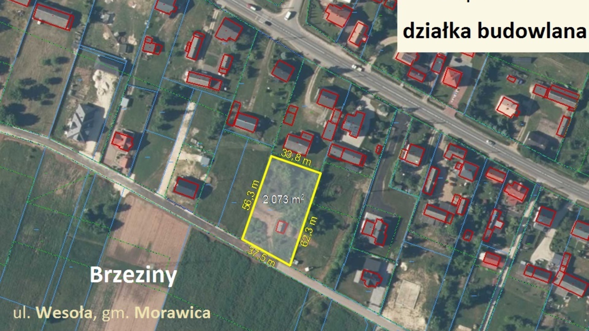 Działka przylega całą szerokością (37,5m) bezpośrednio do ul. Wesołej